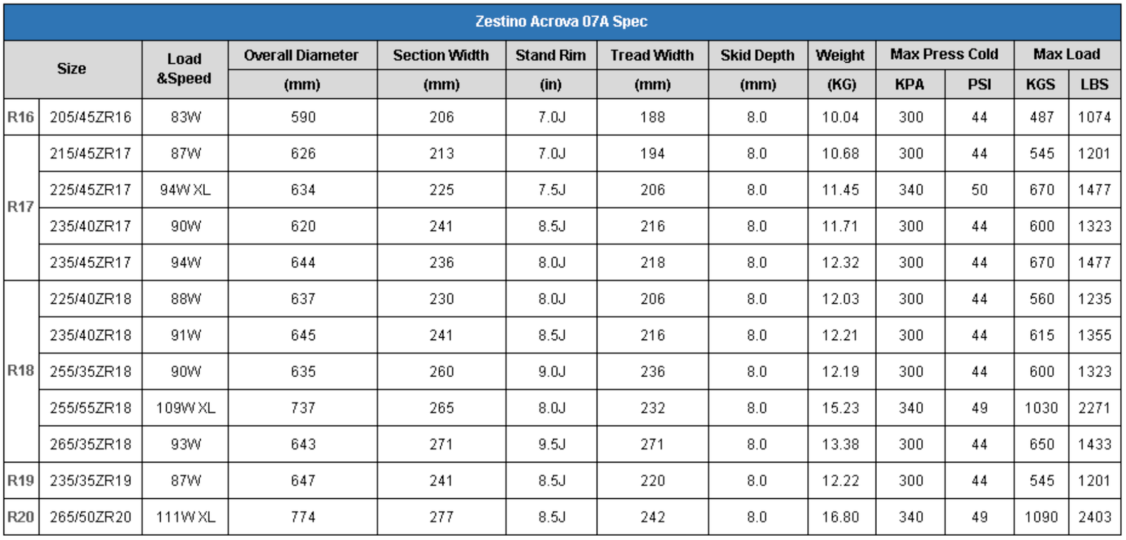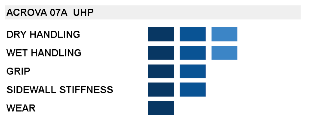 07A UHP (280TW) er den harde gummiblandingen i Zestino Acrova-serien – et høyytelses, veigodkjent dekk med fokus på drifting og gatebruk, og med E-merking. Utmerket slitestyrke uten å ofre grep og kontroll. Acrova 07A UHP er vår mest populære modell for ytelsesbiler og banekjøring.