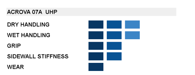 07A UHP (340TW) er den harde gummiblandingen i Zestino Acrova-serien – et høyytelses, veigodkjent dekk med fokus på drifting og gatebruk, og med E-merking. Utmerket slitestyrke uten å ofre grep og kontroll. Acrova 07A UHP er vår mest populære modell for ytelsesbiler og banekjøring.